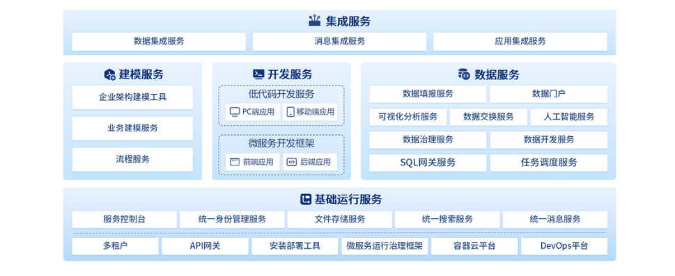 ASP+基礎運行服務:提供了云原生、微服務、組件化、服務化等基礎運行環境和可復用的基礎技術組件、可共享的技術服務,為用戶業務系統建設,從平臺層面實現環境適配能力和全面安全保障能力。
