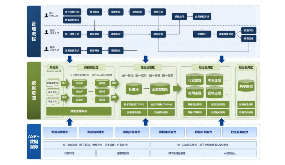 ASP+數據服務:圍繞數據倉庫、數據湖、湖倉一體等技術體系,提供了全技術棧、全鏈路的大數據存儲、開發、治理能力,打通了涵蓋數據集成、存儲、治理、建模、分析、挖掘和服務在內的數據處理全生命周期管理能力,實現了各種數據資源的共享、協同、服務。