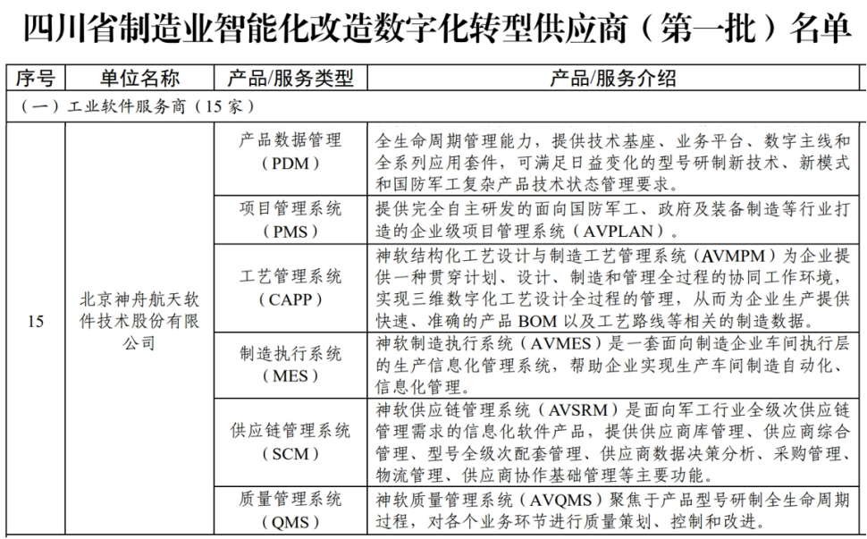 首批供應商的遴選條件,主要包括企業營收規模、專業資質、屬地化服務能力、產品或服務領先性等基本條件,同時要求近三年獲得過國家級試點示范相關榮譽,并在制造領域已有一批成功實踐案例。經過企業申報、審核推薦、形式審查、意見征求等程序,神軟公司憑借自研的產品數據管理系統PDM,項目管理系統PMS、工藝管理系統CAPP、制造執行系統MES、供應鏈管理系統SCM、質量管理系統QMS等工業軟件產品成功入選。
