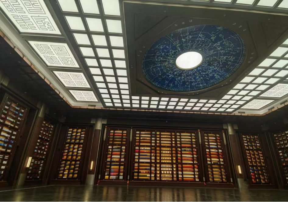 在主建筑文華堂,穹頂之上,取自宋代石刻天文圖的滿天星宿點綴其中,寓意中華文明如星空般浩瀚璀璨。環視四周,15組書柜、3萬余冊古今經典匯成文山字海,彰顯厚重文化底蘊。